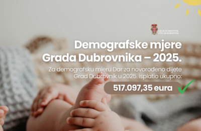 U sklopu mjera socijalnog programa i demografskih mjera Grad Dubrovnik proveo je novu isplatu mjere „Dar za novorođeno dijete“, a sredstva u iznosu 190.500,00 kuna isplaćena su za ukupno 39 roditelja – korisnika mjere.