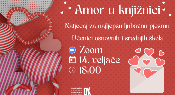 Dubrovačke knjižnice i ove godine povodom Valentinova organiziraju natječaj za najljepšu ljubavnu pjesmu “Amor u knjižnici”. Cilj je ovoga natjecanja poticanje i promoviranje literarnog stvaralaštva mladih te stvaranje prigoda u kojima mogu upoznati osobe sličnih interesa i s njima podijeliti svoja iskustva. Natjecatelji se prijavljuju u dvije kategorije, u jednoj su učenici od petog do osmog razreda, a u drugoj učenici srednjih škola. Svaki učenik u natječaju može sudjelovati s jednom pjesmom.