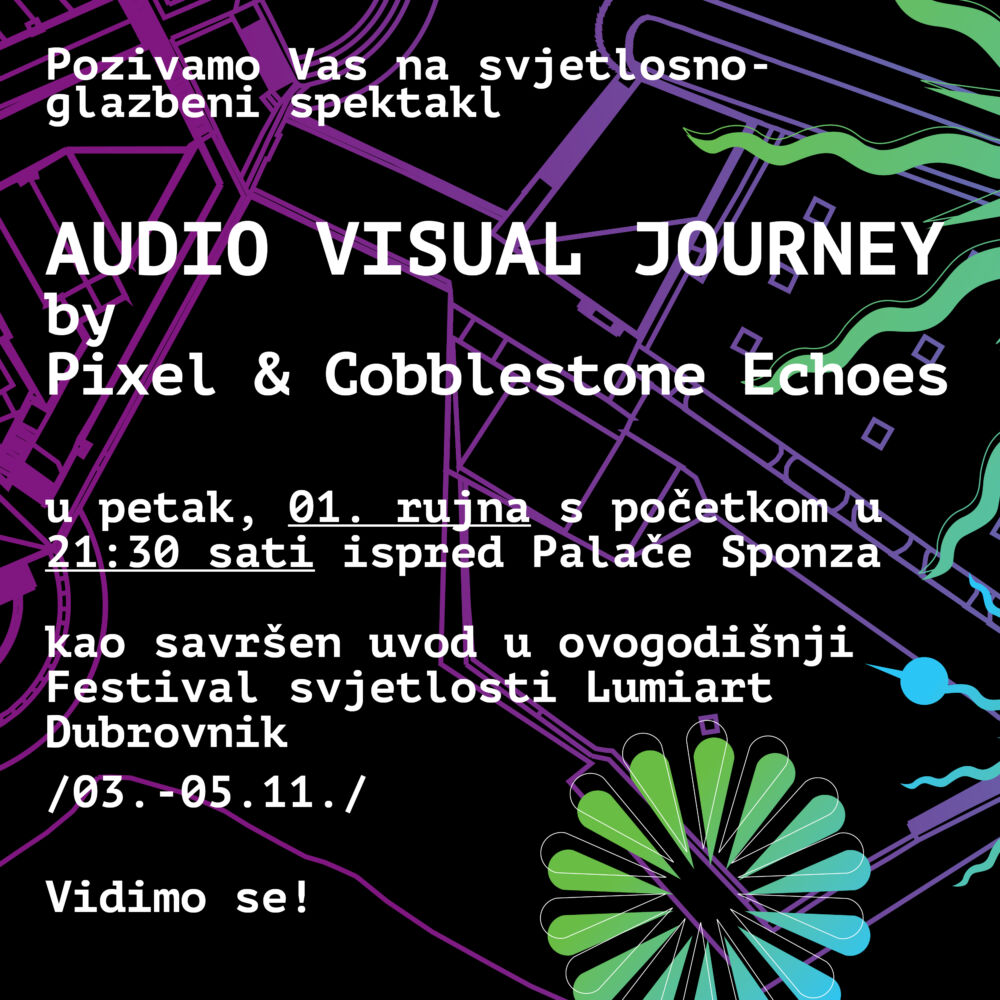 Pridružite nam se u petak, 1. rujna 2023., s početkom u 21:30 sati ispred palače Sponza na najavnom događaju za Festival svjetlosti „Lumiart“ 2023. Ovim audiovizualnim događajem predstavit će nam se idejni začetnici i organizatori dubrovačkog festivala svjetlosti, Pixel Design, uz glazbenu pratnju Cobblestone Echoes sastava (Haris Laus – klavijature, vokal, Tomislav Grković – gitara i Boris Gutić – saksofon, flauta), koji stvaraju jedinstven glazbeni doživljaj spajanjem elektronike i svirke uživo, te su savršena podloga za igru svjetlosti koja nas očekuje na Sponzi.