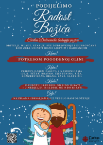 Tradicionalna humanitarna akcija “Podijelimo radost Božića” u organizaciji Caritasa Dubrovačke biskupije održat će se na Pilama u subotu, 18. prosinca od 9 do 16 sati i u nedjelju, 19. prosinca od 9 do 13 sati, a pomoć će biti usmjerena stanovnicima potresom pogođene Gline.