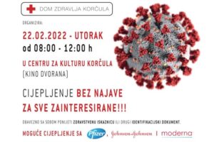 Dom zdravlja Korčula organizira akcije cijepljenja bez najave za sve zainteresirane i to, u utorak, 22. veljače 2022. u Centru za kulturu Korčula u Korčuli od 8 do 12 sati, te u četvrtak, 24. veljače 2022. u sportskoj dvorani Osnovne škole Orebić u Orebiću od 13 do 15 sati.