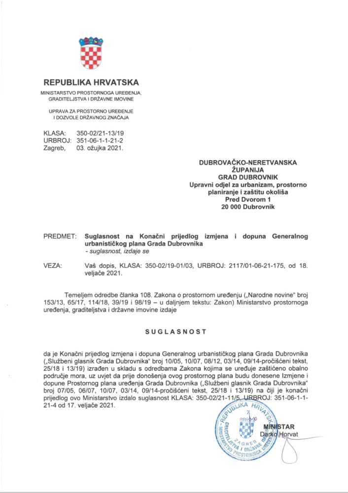 Nakon izrađenih izmjena i dopuna GUP-a Grada Dubrovnika te dobivene suglasnosti Dubrovačko-neretvanske županije danas smo dobili suglasnost i ministarstva na GUP Grada Dubrovnika.