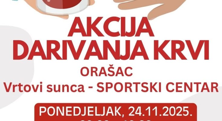 Dubrovački Crveni križ poziva na akciju darivanja krvi koja će se održati 24. studenog 2025. u vremenu od 09-12 u Orašcu, u sportskom centru Vrtova sunca.