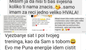 Dogodile su se i divne transformacije jer zaista za biti fizički aktivan nije potrebno ulagati u skupu opremu. Još ako imaš zaista manjak slobodnog vremena onda je vježbanje kod kuće odličan alat koji vam može pomoći. Ne gubite vrijeme za odlazak na trening ili parking. Jednostavno odradite trening, otuširate se, pripremite si dobar obrok i nastavite dalje. Uvijek svima preporučam i duže šetnje i brzi hod u svrhu očuvanja zdravlja i pokretljivosti. Online treniranje je također dobar alat jer se možeš priključiti raznim treninzima koje možda nemate u svom gradu, a htjeli biste trenirati. I sama imam ljude iz različitih gradova koji vježbaju uz moju podršku. Uvijek stavljam naglasak na ispravno vježbanje i pravilno izvođenje pokreta. Mnogi će reći uživo je bolje. Naravno da uvijek preporučam i sve je bolje uživo uz trenera, ali kako pokušavamo izvući maksimum iz situacije, onda je online trening ako nemate izbora super stvar. Ukoliko nemate dobre osnove i predznanje preporučam uvijek uložiti i uzeti dodatne satove sa trenerom jer je to znanje koje ostaje sa vama i na njemu se temelji vaš daljni razvoj i rast koji nas kasnije dovodi do postavljenog cilja.