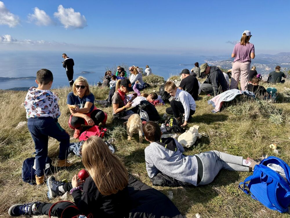 Ove smo se godine odlučili uspon voditi malo strmijom sjeverozapadnom padinom, a pitomiju jugoistočnu padinu ostavili smo za spust s vrha natrag u selo. Uspon od nepunih 50min prolazi lagano uz dva kratka zaustavljanja, puno priče i zanimanja djece za zrakoplovnu nesreću od prije 28g. na sjevernoj padini Stražišća. Na vrh izlazimo oko 10:50, uživamo u zasluženoj marendi, sunčanju, druženju i nezaobilaznoj grupnoj fotografiji. Sunce je već visoko pa nakon grupne fotografije i okrijepe slijedi oprezan silazak uz prekrasan pogled prema našoj matičnoj planini, konavoskom polju i zračnoj luci.