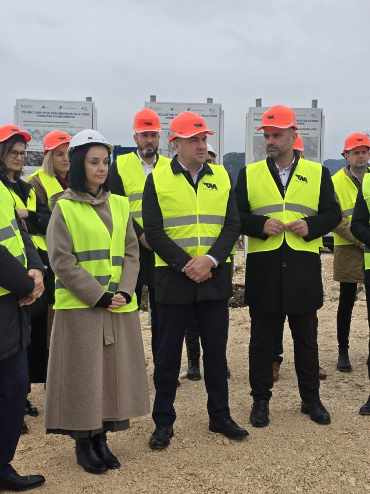 Ministrica zaštite okoliša i zelene tranzicije Marija Vučković, župan Dubrovačko-neretvanske županije Blaž Pezo i generalni direktor Hrvatskih voda Zoran Đuroković, zajedno s gradonačelnicima neretvanskih gradova i načelnicima općina obišli su radove na Projektu zaštite od zaslanjivanja tala i voda na području donje Neretve.