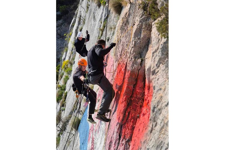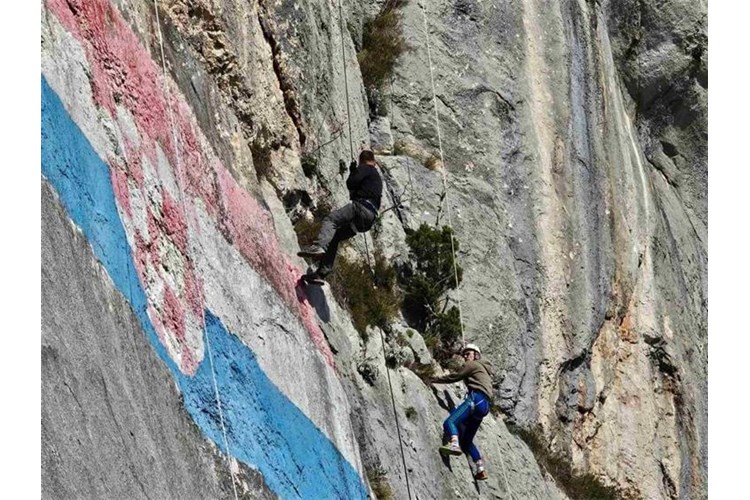U zahtjevnom alpinističkom pothvatu obnovili su zastavu koja se na visini od 400 metara nalazi na tom mjestu još od vremena Drugog svjetskog rata nakon čega je izbrisana. Obnovljena je osnutkom Hrvatske države, da bi u vrijeme Domovinskog rata bila uništena ciljanim granatiranjem neprijateljske vojske. Ponovno je obnovljena 1993. i posljednji put 2008. godine.