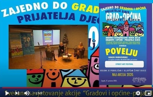 Središnji koordinacijski odbor akcije “Gradovi i općine prijatelji djece”, na svečanom savjetovanju održanom online 21. prosinca 2020., dodijelio je Gradu Dubrovniku povelju “Naj-akcija 2020.” za uspješno provedenu akciju za djecu pod nazivom “Street Art Festival”.