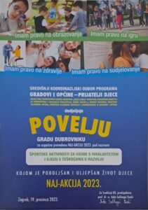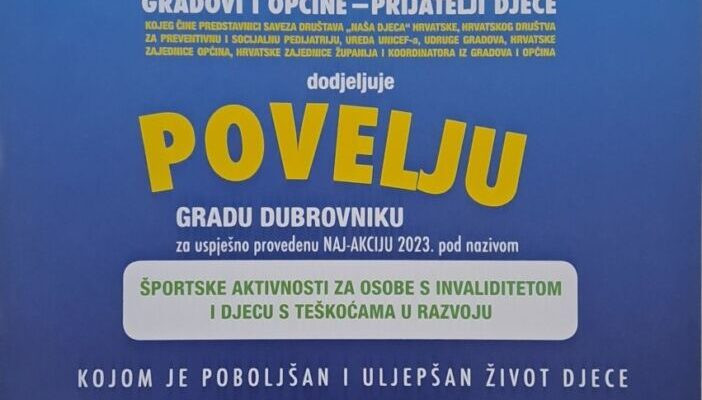 Na tematskom i svečanom savjetovanju programa “Gradovi i općine prijatelji djece”, održanom u Zagrebu 19. prosinca, Gradu Dubrovniku dodijeljena je Povelja Saveza društava “Naša djeca” Hrvatske za Naj-akciju 2023. za projekt “Športske aktivnosti za osobe s invaliditetom i djecu s teškoćama u razvoju”. Povelju je u ime Grada Dubrovnika primio zamjenik pročelnika za obrazovanje, šport, socijalnu skrb i civilno društvo Miho Katičić.