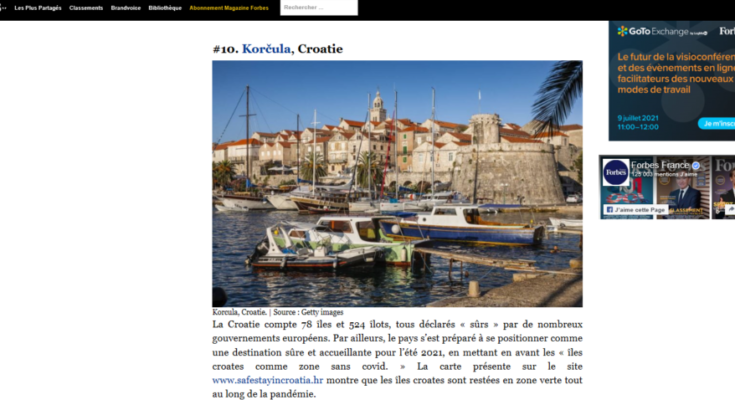 Naime, posljednji broj magazina Destination u cijelosti je posvećen Hrvatskoj. Časopis na 100-tinjak stranica govori o ljepotama Hrvatske, a osim plaža i otoka, prikazane su i ljepote destinacija iz unutrašnjosti poput Zagorja te city-break destinacija kao što su Zagreb, Split i Rijeka. Časopis je tiskan u 100 tisuća primjeraka i bit će dostupan na prodajnim mjestima diljem Francuske sve do kraja ljeta. U francuskom izdanju Forbesa objavljena je lista 12 atraktivnih europskih otoka koji su idealne destinacije za posjet ovog ljeta, a na popisu se, uz najljepše portugalske, grčke i španjolske otoke, našla i Korčula uz dodatne informacije oko trenutnih uvjeta za ulazak u Hrvatsku i projekta Safe Stay in Croatia.