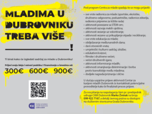 Ovim pozivom CKM Dubrovnik želi okupiti sve prijedloge aktivnosti i zajednički ih prijaviti na javni poziv Grada Dubrovnika u sklopu kreiranja programa Centra za mlade u vrijednosti od 33.844.32 EUR (255.000,00 kuna). U slučaju uspješne prijave na javni poziv, CKM Dubrovnik će kontaktirati potencijalne provoditelje kako bi finalizirali proces prijave. Ukoliko se ostvari financiranje iz javnog poziva, sredstva će biti raspodijeljena na sve prijedloge aktivnosti u iznosima od 300€, 600€ i 900€.