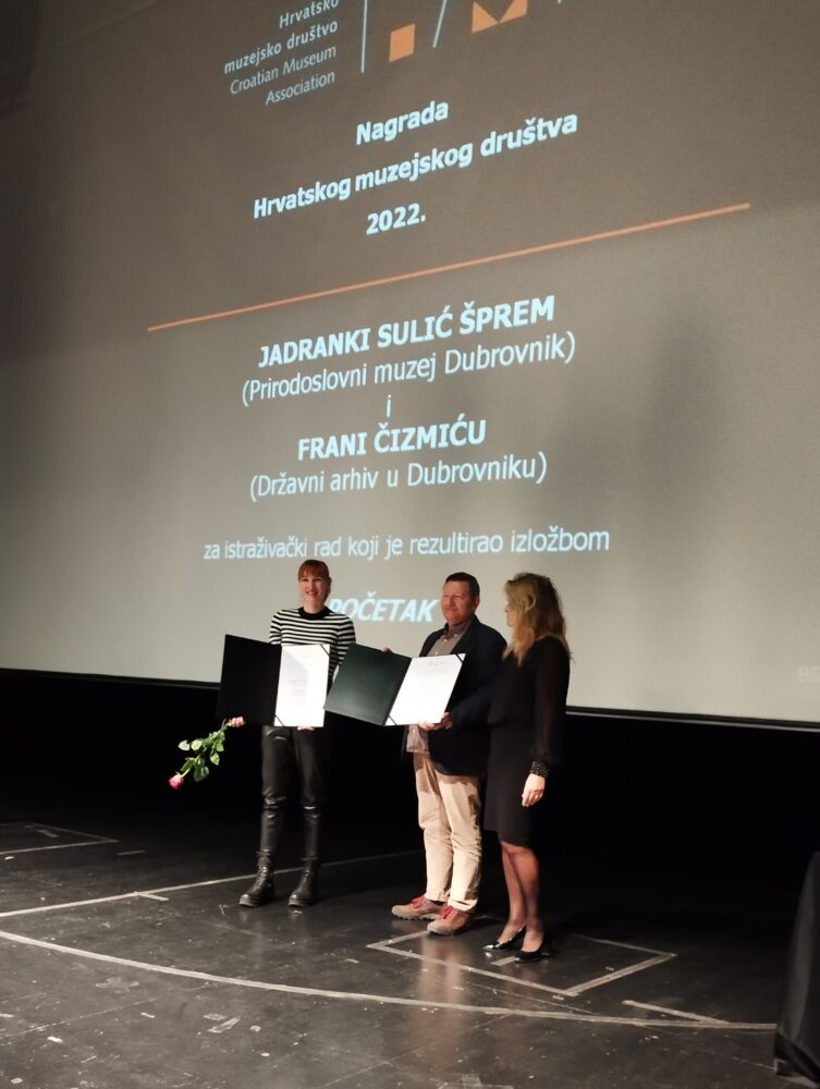 Svečana dodjela nagrada Hrvatskog muzejskog društva za 2022. godinu održana je 12. prosinca 2023. u Muzeju suvremene umjetnosti u Zagrebu. Dobitnici godišnje nagrade za izuzetna ostvarenja u muzejskoj struci u kategoriji za provedeni istraživački rad koji je rezultirao izložbom su autori izložbe Početak dr. sc. Jadranka Sulić Šprem, viša kustosica Prirodoslovnog muzeja Dubrovnik i Frane Čizmić, arhivist Državnog arhiva u Dubrovniku.