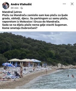 Plažu na Mandraču zamislio sam kao plažu za ljude grada, obitelji, djecu. Sa parkingom uz samu plažu, vaporetom iz Mokošice i Gruža do Mandrača. Sada se na dijelu plaže nema gdje staviti šugaman. Kome smetaju Dubrovčani?” – napisao je na svom Facebook profilu nezavisni gradski vijećnik i bivši gradonačelnik Andro Vlahušić.