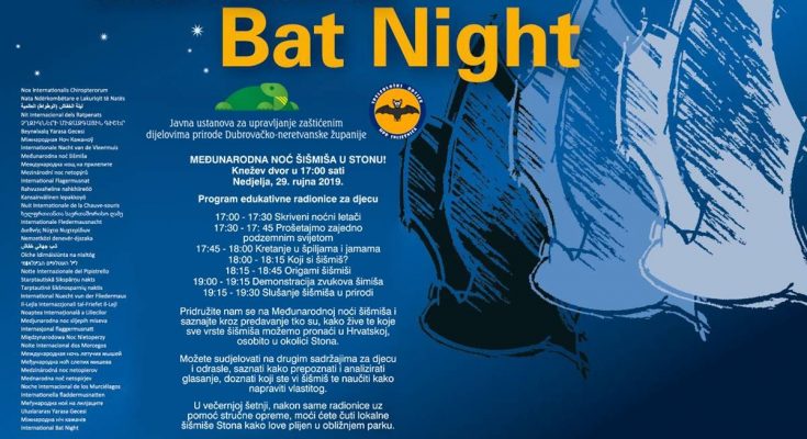 Međunarodna noć šišmiša ove će godine biti obilježena u Kneževom dvoru u Stonu u nedjelju 29. rujna 2019., a program započinje u 17,00 sati.