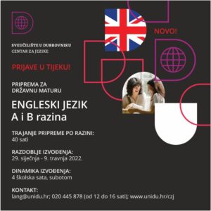 Centar za jezike Sveučilišta u Dubrovniku organizira pripreme za državnu maturu iz engleskog jezika A i B razine. Program je namijenjen učenicima završnih razreda srednjih škola gimnazijskog, strukovnog i umjetničkog smjera te drugim kandidatima za polaganje državne mature. Prijave traju do 20. siječnja 2022. godine.
