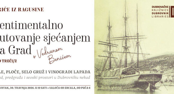 U okviru ciklusa „Sentimentalno putovanje sjećanjem na Grad s Vedranom Benićem“, u organizaciji Dubrovačkih knjižnica, drugo predavanje održat će se u četvrtak, 30. travnja 2026. godine, u Saloči od zrcala Narodne knjižnice Grad, s početkom u 19