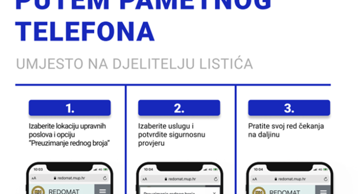 Za rješavanje upravnih poslova građani više ne trebaju čekati u redovima, već svoj redni broj za pojedinu uslugu mogu neposredno preuzeti na redomat uređaju smještenom na ulazu u prostore upravnih poslova ili putem aplikacije za mobilni pristup redomat.mup.hr koju mogu instalirati na svojim mobilnim telefonima i preko nje odabrati svoj termin dolaska i pratiti red čekanja.