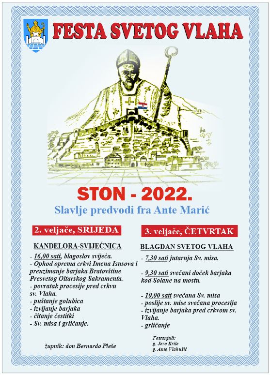 Objavljeni su proglas i program Feste sv. Vlaha u Stonu, a potpisuju ih ovogodišnji stonski festanjuli Jero Krile i Ante Vlahušić sa župnikom don Bernardom Plešeom.
