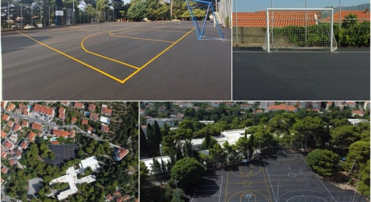 Nastavno na obnovu ograde i drugih elemenata igrališta, Upravni odjel za komunalne djelatnosti, promet i mjesnu samoupravu Grada Dubrovnika putem ugovornog izvođača angažiranog za održavanje dječjih igrališta i sportskih terena obnovio je asfaltnu podlogu na sportskom terenu OŠ Lapad.