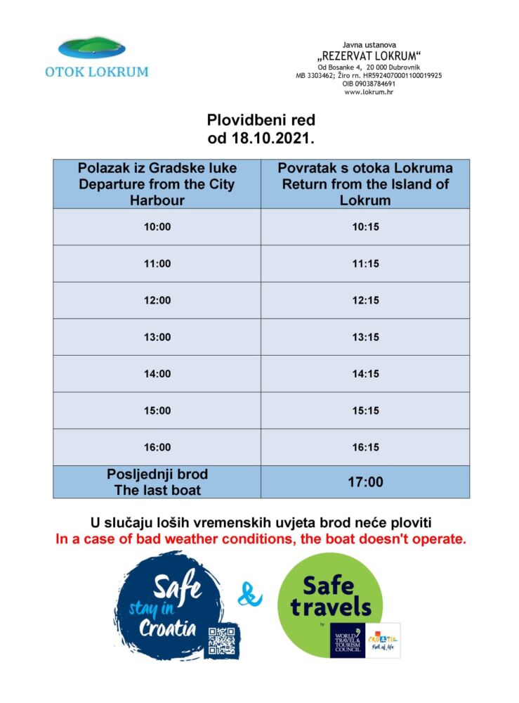 Javna ustanova Rezervat Lokrum objavila je novi plovidbeni red. Od ponedjeljka, 18.listopada, brodovi Skala i Zrinski vozit će po novom rasporedu. Zadnji brod s Lokruma polazit će u 17 sati.