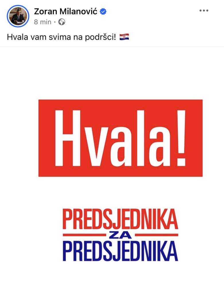 Nakon što su u 19 sati objavljene prve izlazne ankete agencije Ipsos prema kojima Zoran Milanović pobjeđuje u prvom krugu s osvojenih 51,5%, oglasio se i sam Milanović na svojoj facebook stranici s fotografijom i kratkom porukom: ‘Hvala vam svima na podršci’