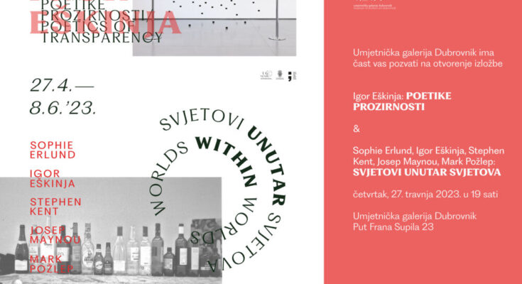 U Umjetničkoj galeriji Dubrovnik u četvrtak, 27. travnja u 19 sati otvaraju se dvije značajne izložbe, samostalna izložba jednog od najznačajnijih predstavnika hrvatske suvremene umjetničke scene, Igora Eškinje pod nazivom „Poetike prozirnosti“ te međunarodna grupna izložba „Svjetovi unutar svjetova“. Kustosica obiju izložbi je kustosica Umjetničke galerije Dubrovnik, Jelena Tamindžija Donnart.