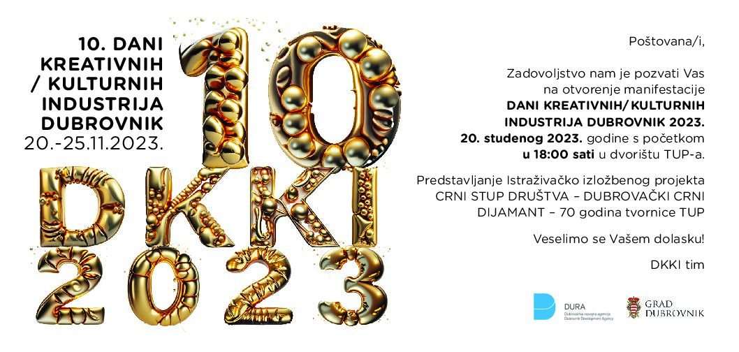 Otvorenje jubilarnih desetih po redu Dana kreativnih/kulturnih industrija (DKKI) 2023. održati će se 20. studenog 2023. godine u 18:00 sati u dvorištu TUP-a, u organizaciji Dubrovačke razvojne agencije DURA, a pod pokroviteljstvom Grada Dubrovnika i Ministarstva kulture i medija Republike Hrvatske.