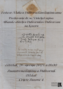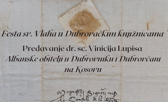 U organizaciji Dubrovačkih knjižnica, a u okviru Feste sv. Vlaha, u četvrtak 26. siječnja s početkom u 18 sati u Znanstvenoj knjižnici Dubrovnik, dr. sc. Vinicije Lupis održat će predavanje na temu Albanske obitelji u Dubrovniku i Dubrovčani na Kosovu. Na predavanju će biti riječi o kulturnim vezama Hrvata i Albanaca koji se mogu pratiti kroz dugi niz stoljeća. Početkom 13. stoljeća Dubrovnik je sklopio trgovački ugovor o slobodi trgovine s Dimitrijem, sinom albanskog velikaša Progona, koji je bio gospodarem teritorija između Lješa, Drača i Ohrida (1208. – 1216.). Postojanje živih trgovačkih veza s Albanijom potvrđuje dubrovački statut iz 1272., gdje se u XXIV. poglavlju druge knjige spominju albanski gradovi Drač, Valona i područje Arbanona (Kruja). Također će biti riječi o spomenu albanskog jezika u Dubrovniku, o njihovom nacionalnom imenu, albanskim svećenicima u Dubrovniku gdje je njjihov veliki broj posljedica progona katolika koje je provodila srpska dinastija Nemanjića, odnosno srpski kralj Dušan, kasniji car te o ostalim kulturnim fenomenima koji povezuju Hrvate i Albance.