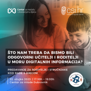 Obzirom na sve veći porast zlostavljanja djece kao rezultat razvoja novih oblika zlostavljanja s razvojem tehnoloških komunikacijskih dostignuća, Centar za sigurniji Internet sa Zajednicom tehničke kulture Grada Dubrovnika organizira radionice za učenike osnovnih i srednjih škola te predavanje za roditelje i stručnjake, u Centru za mlade Dubrovnik 21. i 23. ožujka.