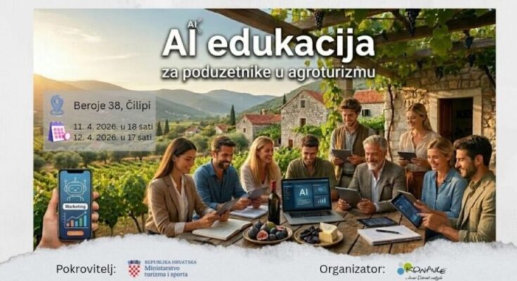 Nova stručna edukacija “Primjena umjetne inteligencije za poduzetnike u agroturizmu” organizira se u prostoru KUD-a Čilipi, Beroje 38 Čilipi u subotu i nedjelju, 11. i 12. travnja 2026. godine. U subotu predavanje počinje u 18 sati, a u nedjelju u 17 sati.
