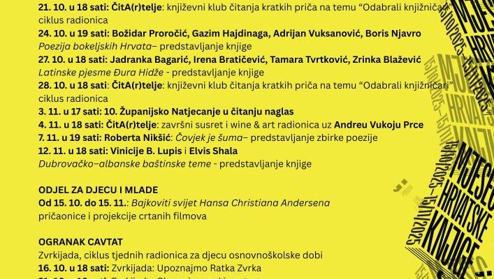 Narodna knjižnica Grad (Ulica od puča 6) svoj program Mjeseca hrvatske knjige počinje ciklusom radionica ČitA(r)telje (21.10., 28.10. i 4.11. u 18 sati), odnosno književnim klubom čitanja kratkih priča na temu Odabrali knjižničari (zbog ograničenog broja mjesta prijave se primaju na e-mail informacijska.sluzba@dkd.hr). Božidar Proročić, Gazim Hajdinaga, Adrijan Vuksanović i Boris Njavro, 24. 10. u 19 sati, predstavit će knjigu Poeziju bokeljskih Hrvata. Jadranka Bagarić, Irena Bratičević, Tamara Tvrtković i Zrinka Blažević predstavit će Latinske pjesme Đura Hidže 27. 10. u 18 sati. Deseto Županijsko Natjecanje u čitanju naglas održat će se 3. 11. u 17 sati. Predstavljanje zbirke poezije Čovjek je šuma Roberte Nikšić bit će 7. 11. u 19 sati, a 12. 11. u 18 sati, Vinicije Lupis i Elvis Shala predstavit će knjigu Dubrovačko–albanske baštinske teme.