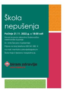 ”Obavještavamo Vas da 21.11.2022. počinje Škola nepušenja u prostoru Zavoda za javno zdravstvo Dubrovačko-neretvanske županije.