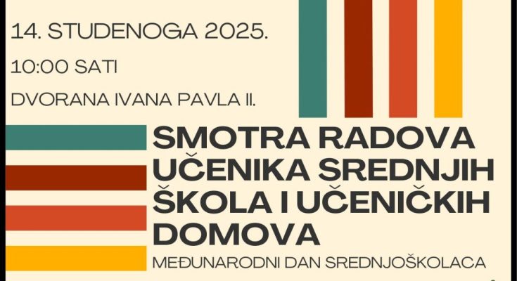 Povodom Međunarodnog dana srednjoškolaca u organizaciji Vijeća za kulturu i znanost Dubrovačke biskupije u petak 14. studenog održat će se Smotra radova učenika srednjih škola i učeničkih domova Dubrovačke biskupije.