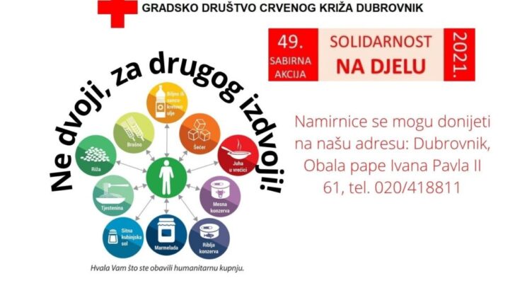 Ovogodišnju, 49. po redu, akciju „Solidarnost na djelu 2021.“ provodimo pod motom „Ne dvoji, za drugog izdvoji!“. Akcija je započela 8. listopada, a  Gradsko društvo Crvenog križa Dubrovnik provodit će je do kraja studenoga 2021. godine na način da će se pojačano prikupljati novčane donacije i osnovni prehrambeni proizvodi: brašno, ulje, riža, šećer, sol, tjestenina, riblje i mesne konzerve, mlijeko, keksi, slatki namazi, juha u vrećici.