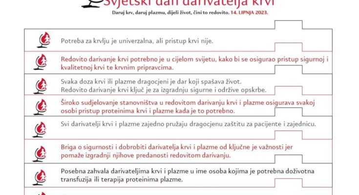 Dana 14. lipnja 2023. godine u cijelom svijetu obilježit će se Svjetski dan darivatelja krvi. Ovaj je dan službeno proglašen 2005. godine na Svjetskoj zdravstvenoj skupštini.
