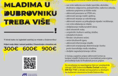 Ostvarivanje ideje nikad nije bilo lakše – budite kreativni, ispunite obrazac Centra za karijere mladih Dubrovnik i sudjelujte u kreiranju programa Centra za mlade....
