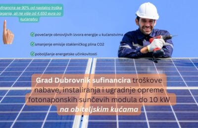Grad Dubrovnik objavio je Javni poziv za sufinanciranje troškova nabave, instaliranja i ugradnje opreme fotonaponskih sunčevih (FN) modula do 10 kW na obiteljskim...