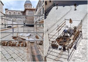 Grad Dubrovnik putem Upravnog odjela za komunalne djelatnosti, promet i mjesnu samoupravu nastavlja radove na sanaciji pločnika u povijesnoj jezgri. U tijeku su radovi na obnovi upalog i oštećenog kamenog pločnika u ulici Pred Dvorom obuhvata 16 metara četvornih. Ujedno se izvode i manje sanacije oštećenih pločnika i bojanje kamenih oznaka ulica unutar zidina.