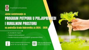 U tijeku je javno savjetovanje Grada Dubrovnika za Program potpora u poljoprivredi i ruralnom prostoru na području Grada za 2024. – 2028. godinu. Program se donosi zbog daljnjeg razvoja poljoprivrede, zaštite vrijednosti ruralnog prostora, kao i jačanja obiteljskih poljoprivrednih gospodarstva, trgovačkih društva, obrta i subjekata malog gospodarstva.