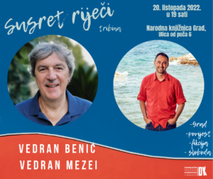 U okviru manifestacije Mjeseca hrvatske knjige, Dubrovačke knjižnice organiziraju tribinu “Susret riječi” čiji su gosti Vedran Benić i Vedran Mezei i koja će se održati u četvrtak, 20. listopada u 19 sati u Čitaonici Narodne knjižnice Grad (Saloča od zrcala). Grad kao književna inspiracija i kulisa za priču; isprepletenost povijesnih činjenica i fikcije; životne priče rastegnute između kopna i mora; likovi koji teže za sigurnošću i slobodom; poveznice su dvaju romana: Trinaesti otok – Vedrana Benića (Društvo dubrovačkih pisaca, 2021.) i Treći ključ – Vedrana Mezeija (Ibis grafika, 2020.) Što se krije iza „velike“ povijesti, koliko su slobode povijesnim likovima u svojim romanima dali autori, kakav je odnos između stvarnosti i fikcije, neka su od pitanja na koje ćemo pokušati dobiti odgovore prilikom ovoga susreta riječi.