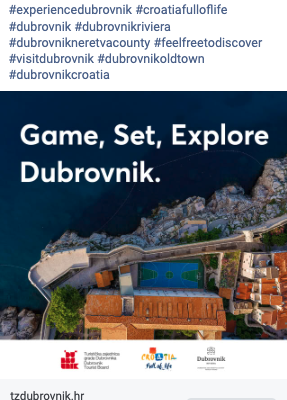 Turistička zajednica grada Dubrovnika pokrenula je geotargetiranu kampanju na društvenim mrežama Facebook i Instagram tijekom trajanja prestižnog teniskog turnira Australian Open, od 12. do 26. siječnja. Kampanja je imala za cilj promovirati Dubrovnik kao idealnu destinaciju za sve ljubitelje tenisa.