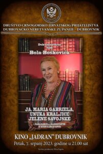 U organizaciji ‚‚Društva crnogorsko hrvatskog prijateljstva dubrovačko-neretvanske županije iz Dubrovnika u petak 7. srpnja u kinu Jadran s početkom u 21 sat bit će održana promocija filma ”Ja, Maria Gabriela, unuka kraljice Jelene Savojske” renomiranog crnogorskog autora filmova i kompozitora Miodraga Bola Boškovića.