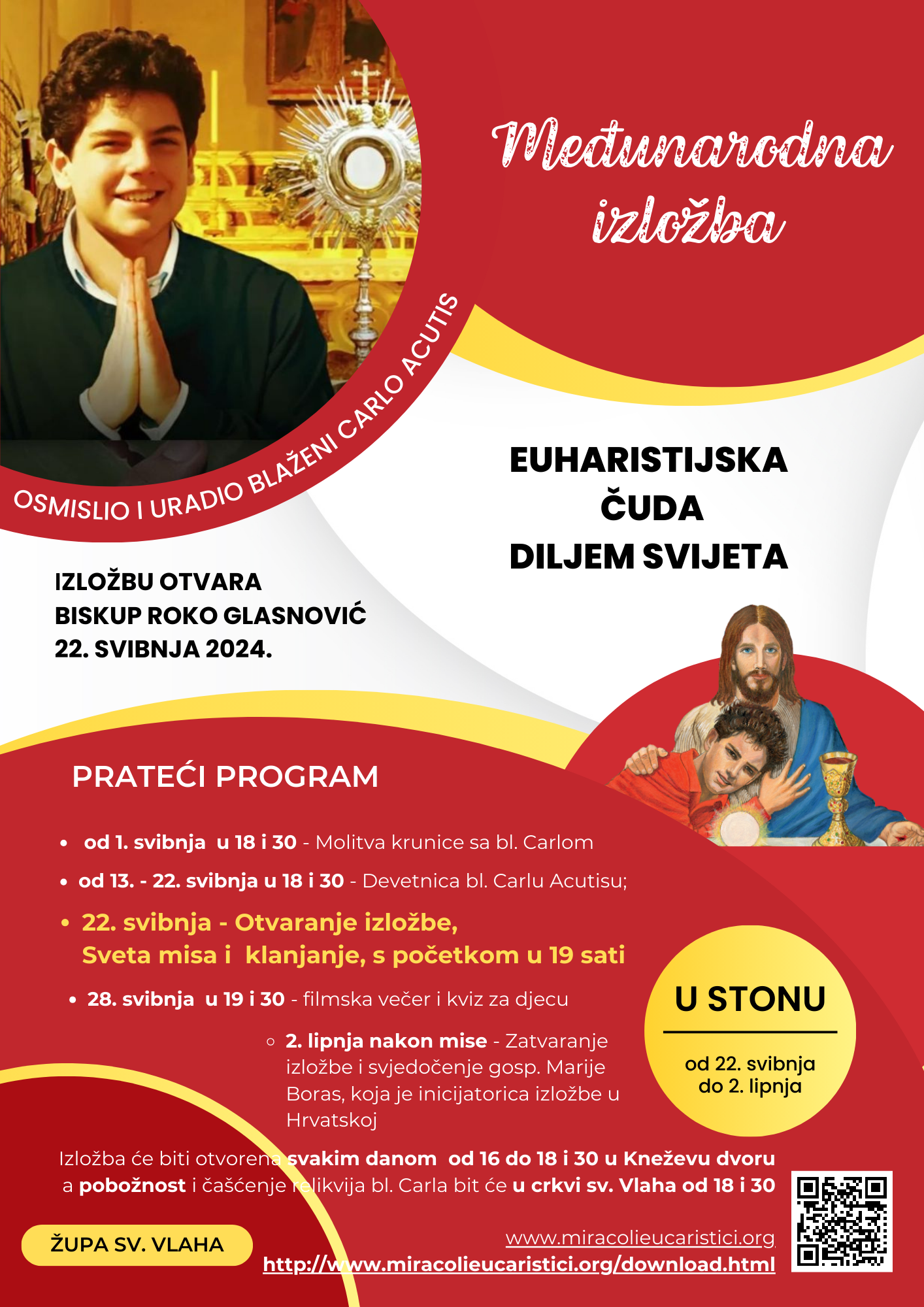 Međunarodna izložba „Euharistijska čuda diljem svijeta“ bl. Carla Acutisa, prvog blaženika ‘milenijanca’ koji je preminuo 2006. godine u dobi od 15. godina, bit će otvorena u župi sv. Vlaha u Stonu. U srijedu 22. svibnja dubrovački biskup Roko Glasnović, nakon mise u župnoj crkvi koja počinje u 19 sati, otvorit će izložbu u Kneževu dvoru.