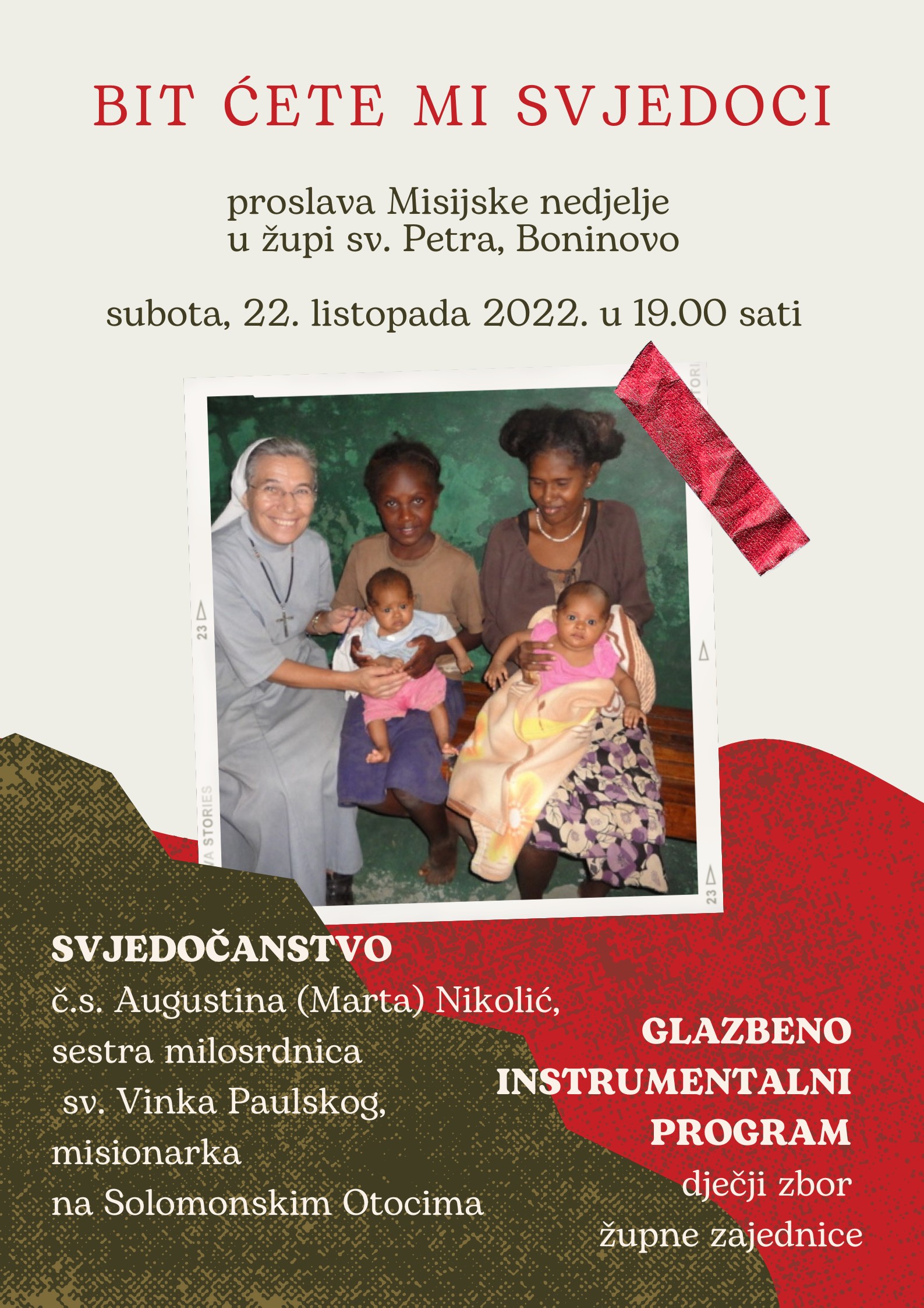 Župna zajednica sv. Petra – Boninovo u subotu, 22. listopada s početkom u 19 sati u župnoj crkvi sv. Petra organizira susret u prigodi obilježavanja Misijske nedjelje pod nazivom „Bit ćete mi svjedoci“. Na susretu će svoje iskustvo radosti i nada, žalosti i tjeskoba, svakodnevnice misionarskog poziva i poslanja s vjernicima podijeliti s. Augustina (Marta) Nikolić, sestra milosrdnica sv. Vinka Pulskog, misionarka na Solomonskim otocima. Prigodnim glazbeno-instrumentalnim programom susret će obogatiti članovi Dječjeg župnog zbora.