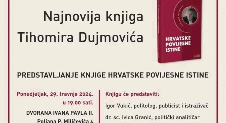 Večeras, u dvorani Ivana Pavla II održat će se predstavljanje knjige Tihomira Dujmovića “Hrvatske povijesne istine”, s početkom u 19 sati.