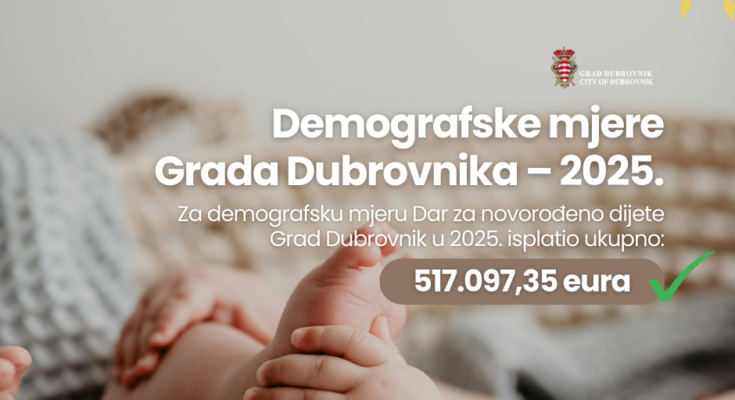 U okviru socijalnog programa i demografskih mjera Grada Dubrovnika za mjeru „Jednokratni dar za novorođeno dijete“ isplaćeno je ukupno 201.110,68 eura za 334 roditelja, dok je za demografsku mjeru „Stalna godišnja naknada za treće i svako daljnje novorođeno dijete“ u 2025. isplaćeno dodatnih 315.986,67 eura.